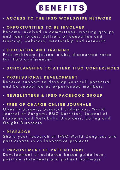 - Discounted registration to IFSO World Congress, IFSO Chapters’ Meetings and IFSO endorsed meetings.